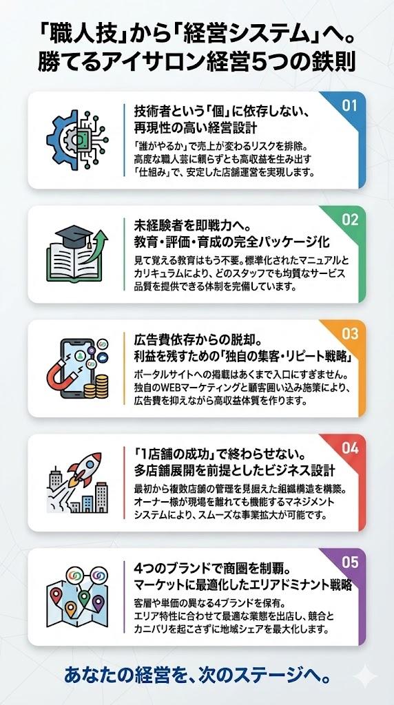 徹底した効率化とスピード施術で、驚異的な回転率を実現。「速さ」と「安さ」で集客を最大化し、常に予約が埋まる繁盛店を作ります。小規模でも数をこなして利益を積み上げる、再現性の高い高効率モデルです。