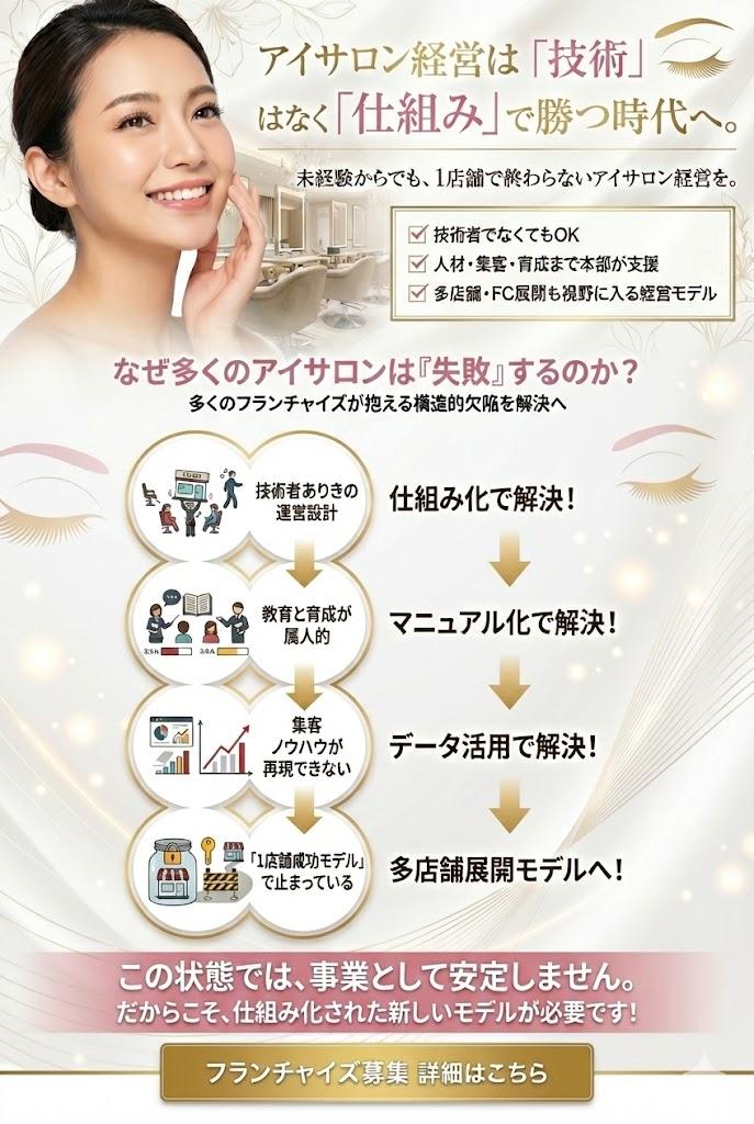 「まつ毛+眉」のセット施術で単価1万円超を実現。数を追わない「高単価・低回転」戦略で、1席あたりの利益を最大化します。スタッフの負担軽減により定着率も向上。安定して高収益を生み出す、持続可能な経営モデルです。