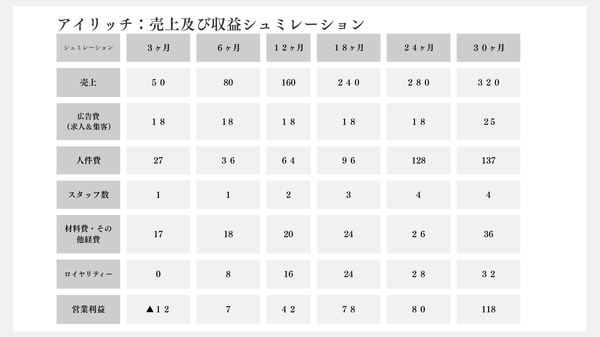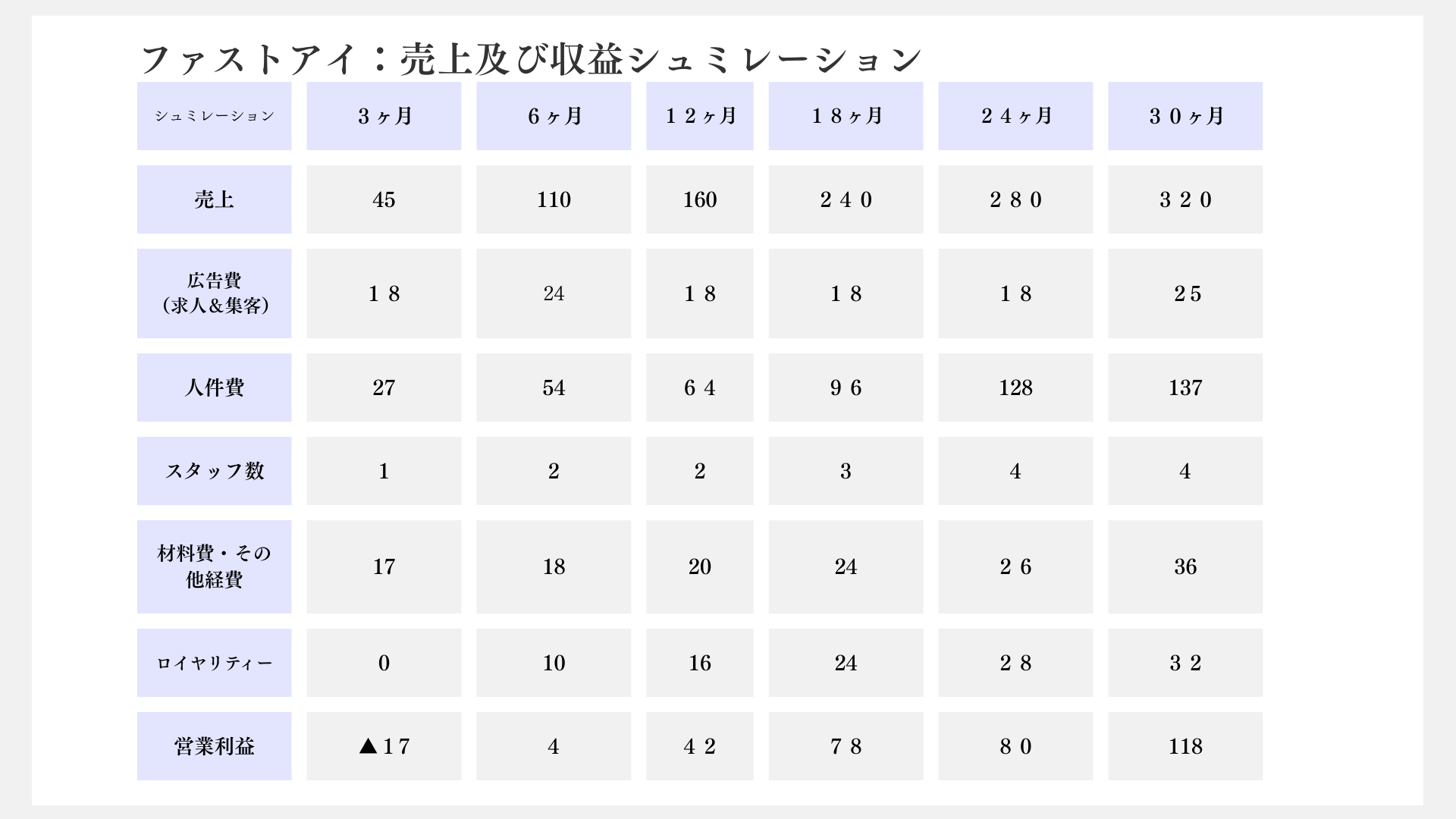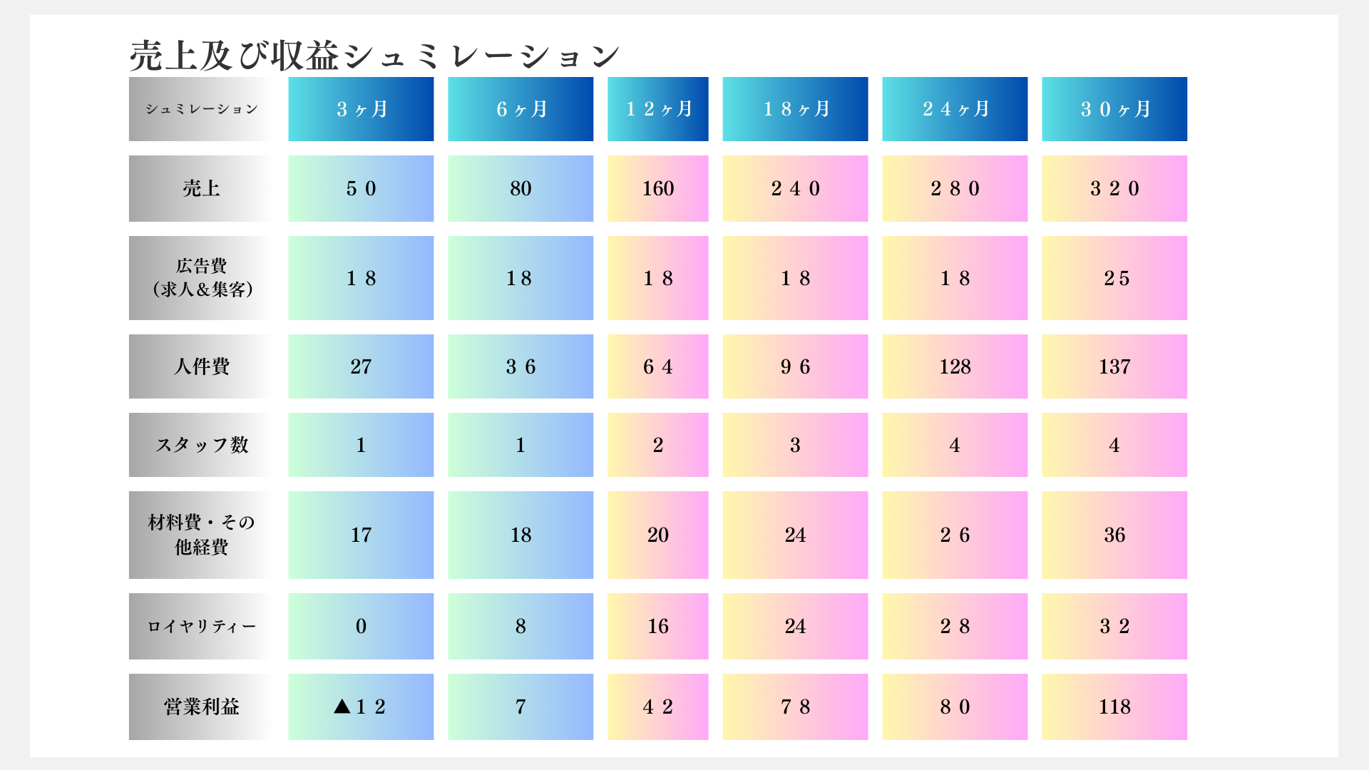 投資回収期間や利益率、人件費まで詳細に可視化。単店の黒字化から多店舗展開での利益最大化まで、事業の成長ステップを具体的な数字でご確認いただけます。